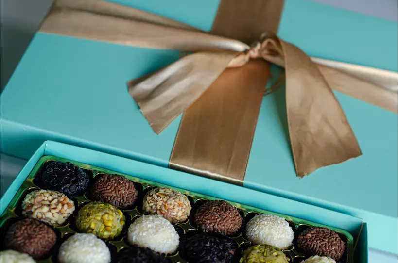 Beautifully packaged in a Merry Christmas gift box decorated with a burgundy/blue/gold ribbon, these brigadeiros are always freshly made, unique and with a taste that is simply unforgettable.